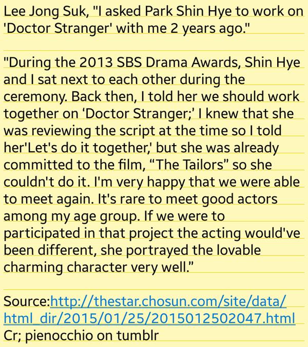 LJS pun memaparkan kesenangannya bertemu kembali dengan Park Shin Hye. Dia juga berkata: "Sangat jarang bertemu dengan artis yang baik dalam berakting dan seumuran. Maka saat kita berpartisipasi dalam proyek itu (Pinocchio-red), dia digambarkan sebagai karakter yang dicintai, menawan dan sangat baik." Nah, karena sekarang kita tau kalo mereka berdua ini udah maen drama bareng, dramanya juga sukses. -Ga hanya sukses dengan rating yang tinggi, tapi sukses juga bikin ga bisa move-on dari drama Pinocchio- jodoh memang gakkan kemana. Ga ketemu di 'Doctor Stranger', ehhh... ketemunya di Pinocchio, endingnya super so sweet gitu..
